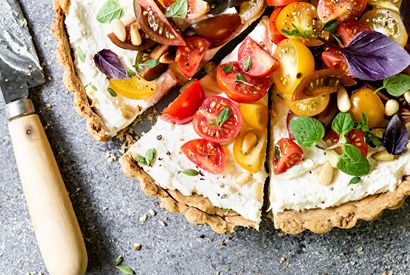 - Spoon the ricotta mixture into the pastry case and smooth the top. Top with tomatoes. Sprinkle with pine nuts.  Scatter with oregano and basil leaves and microgreens.
