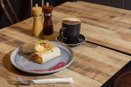The Morning Wrap - Breakfast wrap served with a large coffee. Available for breakfast, every day.
