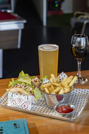 Fiesta For One - Duo of Tacos, either chicken or cauliflower, served with regular fries and your choice of beer, wine, or soft drink. Available all day, every day.