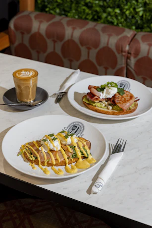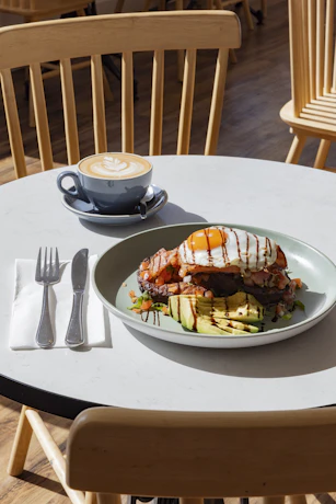All-Day Breakfast - One breakfast main - Eggs Benny or Avocado Smash - with a small hot beverage. Available for breakfast and lunch, weekdays.
