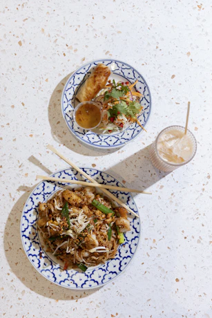 Thai Trinity - Seafood Pad Thai + 1 Veggie Spring Roll + Thai Milk Tea or Lemon Iced Tea. Available for lunch, every day.
