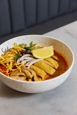 Khao Soi Chicken - Thai coconut curry noodle soup with chicken, crispy noodles, and traditional condiments, served with a can of soft drink. Available for lunch and dinner, every day.