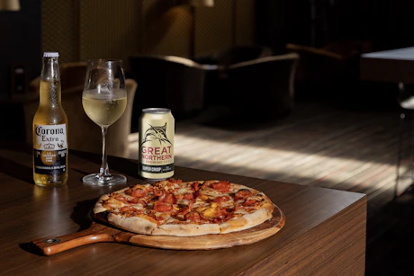 Pizza & Drink Combo - One pizza (choice of Margherita, Pepperoni, Hawaiian, Meatlovers, Supreme, BBQ Pulled Pork, or Chipotle Chicken) with one drink (choice of soft drink, beer, or glass of wine). Available for all day, every day.