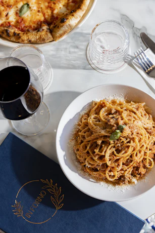 Italian Plate & Pour - One food option (Spaghetti Carbonara, Spaghetti Bolognese, Margherita Pizza, or Hot Salami Pizza) paired with a glass of house wine or a house beer. Available for lunch & dinner, Monday to Thursday.