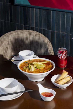 Laksa Lovers - Beef, chicken, or veg & tofu laksa noodle soup, served with two pieces of veg or pork spring rolls and one can of Coke, Coke Zero, or lemon squash. Available for lunch on weekdays.